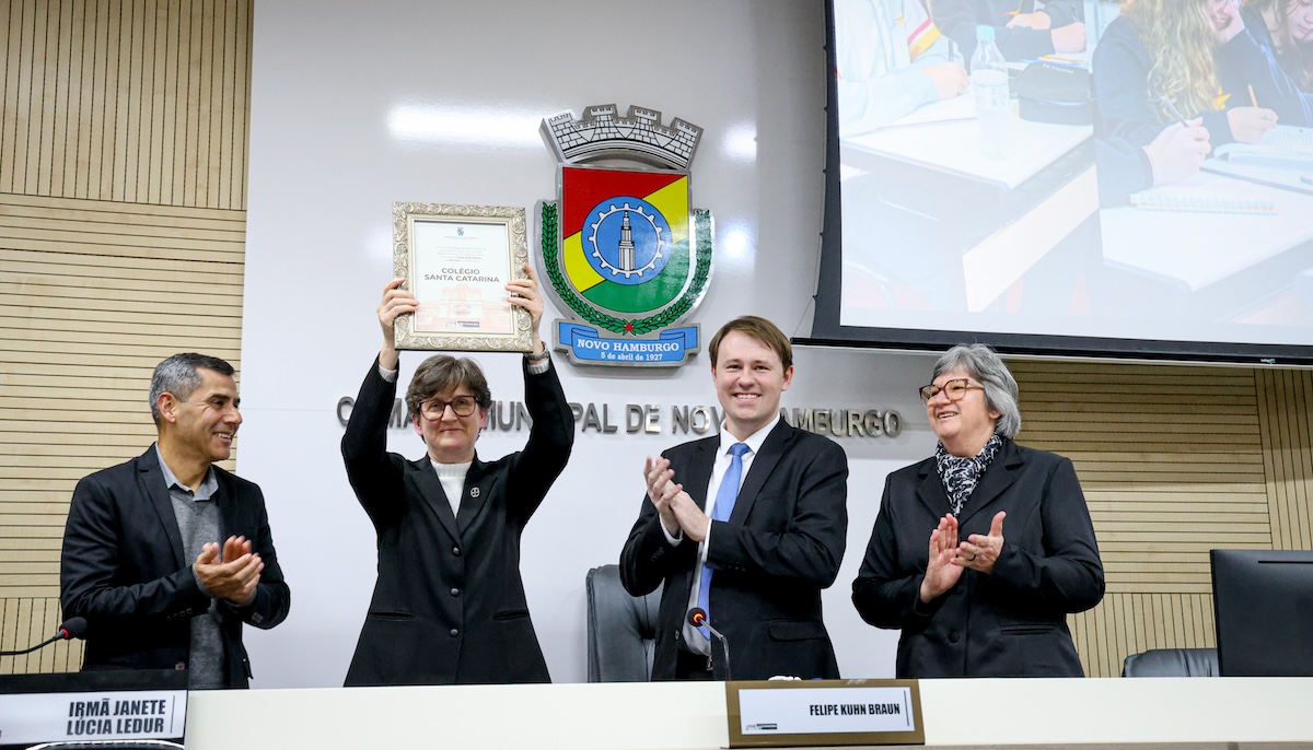Na noite do dia 14 de agosto de 2025, o Colégio Santa Catarina foi homenageado em uma sessão solene realizada pela Câmara de Vereadores de Novo Hamburgo, em reconhecimento aos seus 125 anos de história. A iniciativa partiu do vereador Felipe Kuhn Braun e contou com a presença de autoridades, educadores, estudantes, familiares e membros da comunidade.